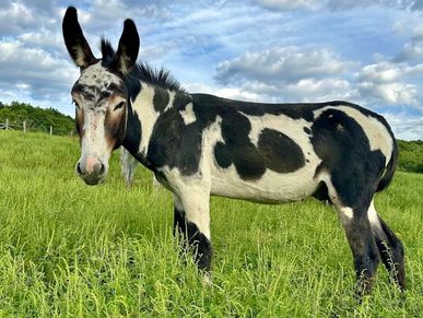 This is a nice young jenny that has been working as a guardian in a herd of cattle. She has been exposed to a spotted jack. She's healthy and has good hooves.
