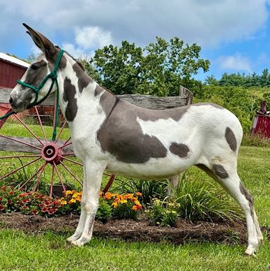 This jenny is gorgeous and gentle with it! She is halter broke and sweet. She is bred to a black and white spotted jack.