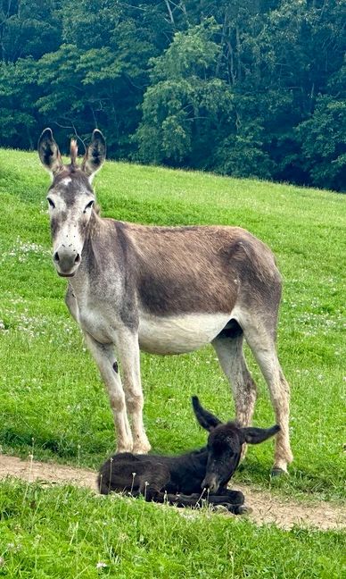 Beautiful, young jenny with sweet baby jenny by side and jenny is bred back to a spotted jack! This is the package deal! Jenny has guarded cattle and goats. She is young, healthy, and has good hooves.